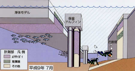 実証実験では、浮体側面は藻類とムラサキイガイ等が、浮体底面はムラサキイガイ等が優占種であることが確認されました。また、浮体に付着する生物の種類と量は長期間存在する防波堤上部の付着生物と生物分布が一致することもわかりました。