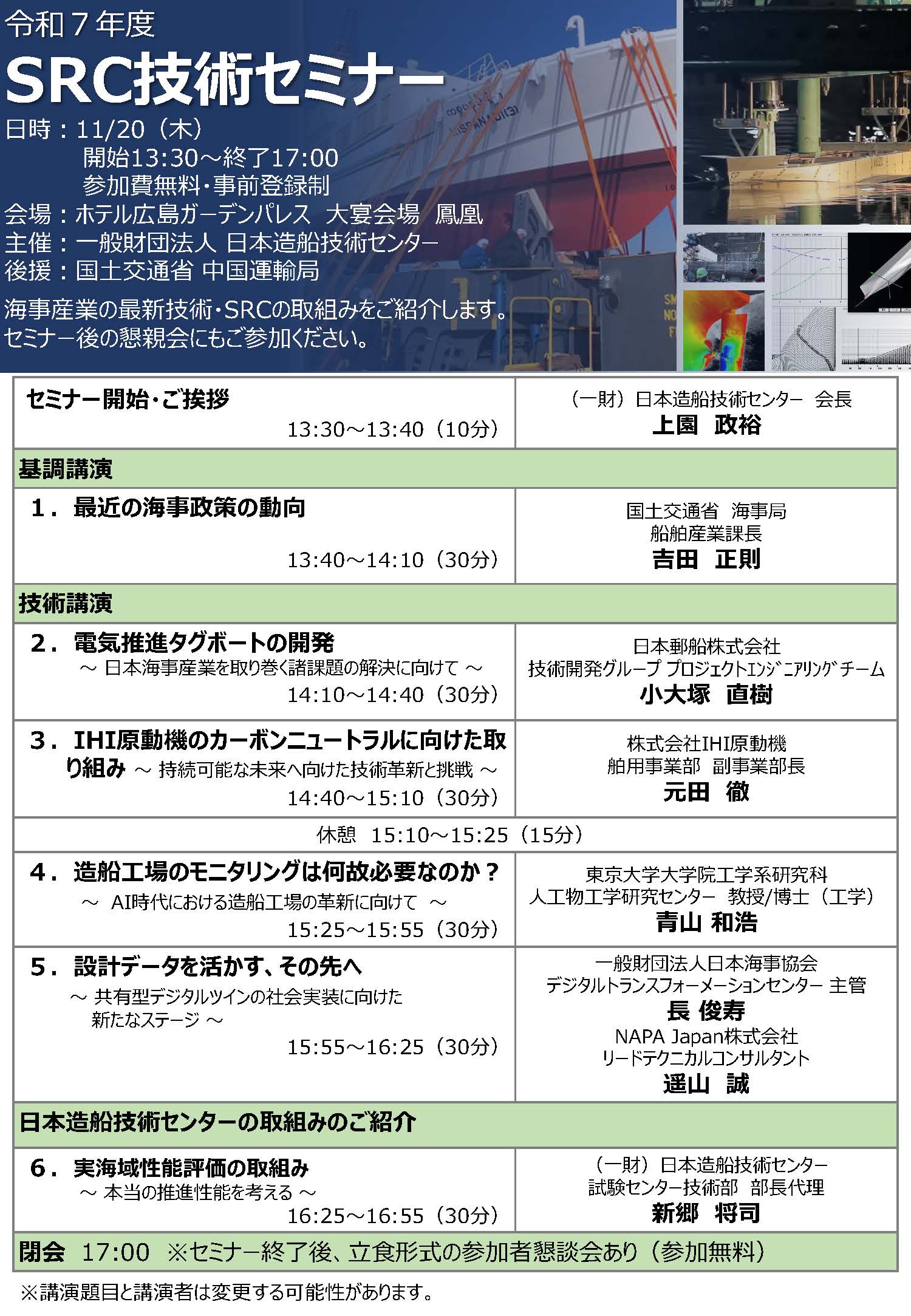 一般財団法人 日本造船技術センター(SRC)は、来たる11月20日(木)に、広島市において技術セミナーを開催いたします。